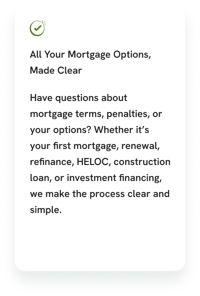 From first-time homebuyer mortgages to refinancing, renewals, investment property financing, construction loans, and private lending — we offer a complete range of mortgage solutions across Ontario.