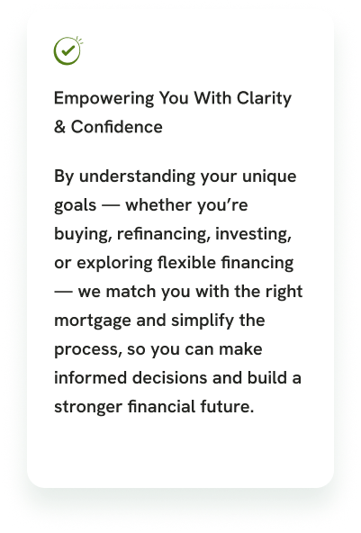 No two clients are the same — and neither are our solutions. From purchasing and investing to unlocking home equity, we offer tailored strategies, trusted advice, and options designed specifically for you.